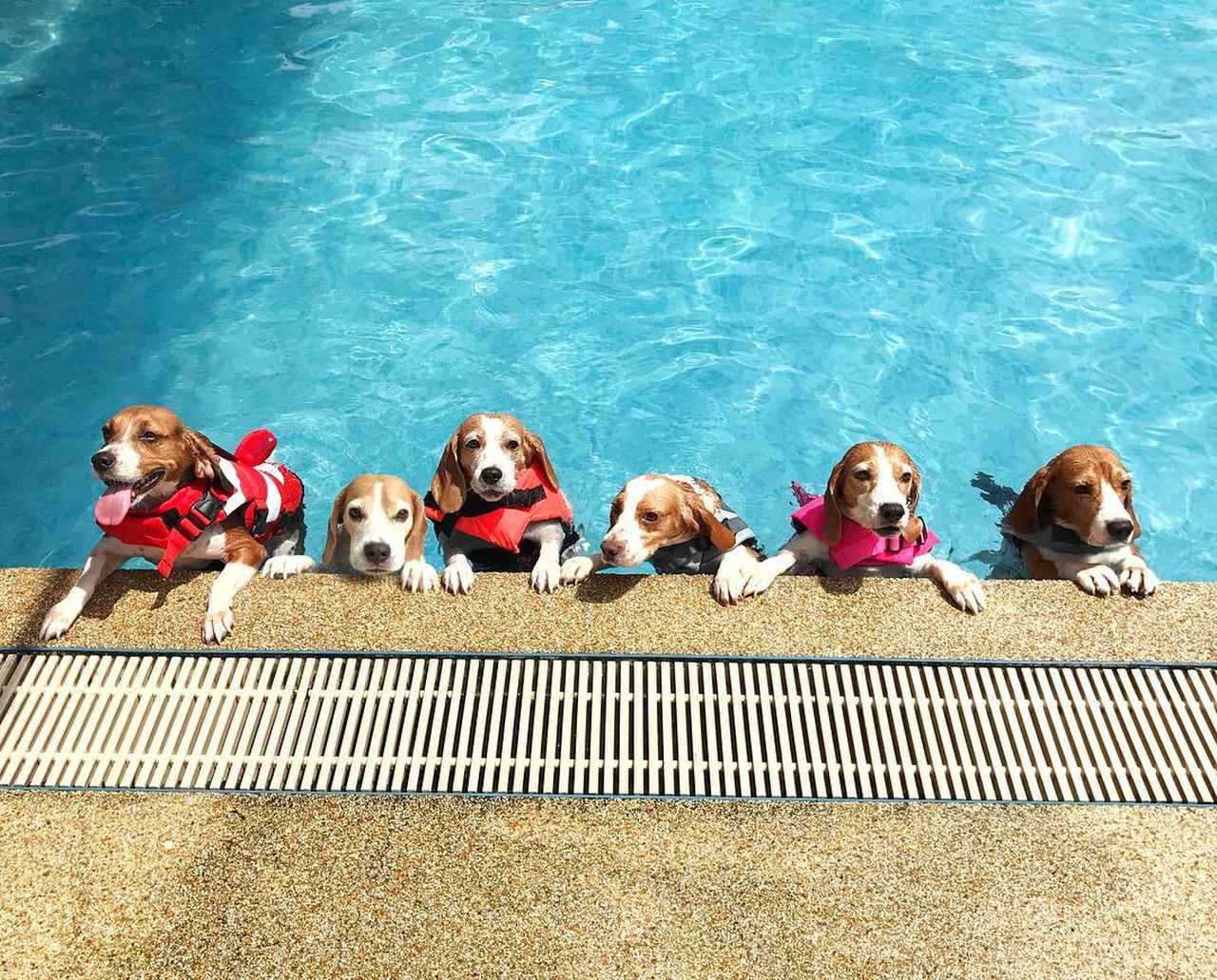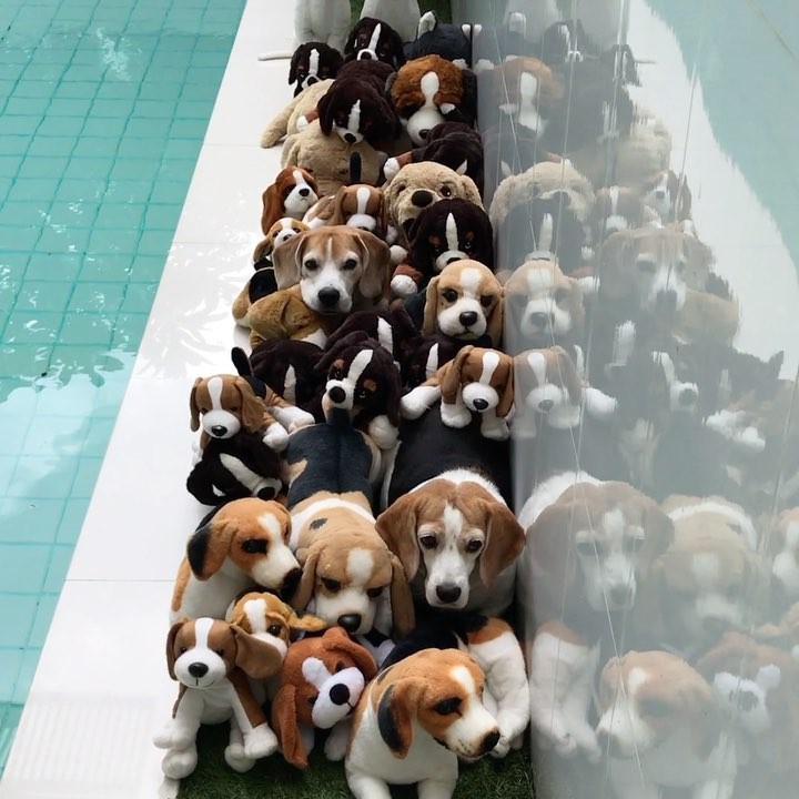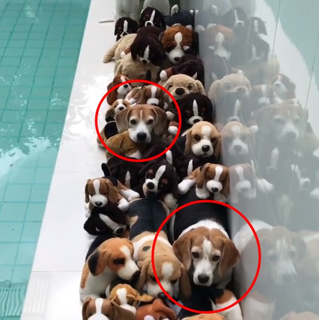プールサイドにたくさん置かれた犬のぬいぐるみ。一見すべてぬいぐるみのように見えるけれど、よく見てみると…なんと本物のワンちゃんが2匹混じっている。
