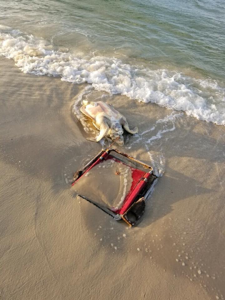 ウミガメの保護に力を入れており、ウミガメが見られることで有名なこのビーチで見つかったこの死骸。首に巻かれたビーチチェアにはフジツボなどが付着していたことから、海に流されたものである可能性が高い。