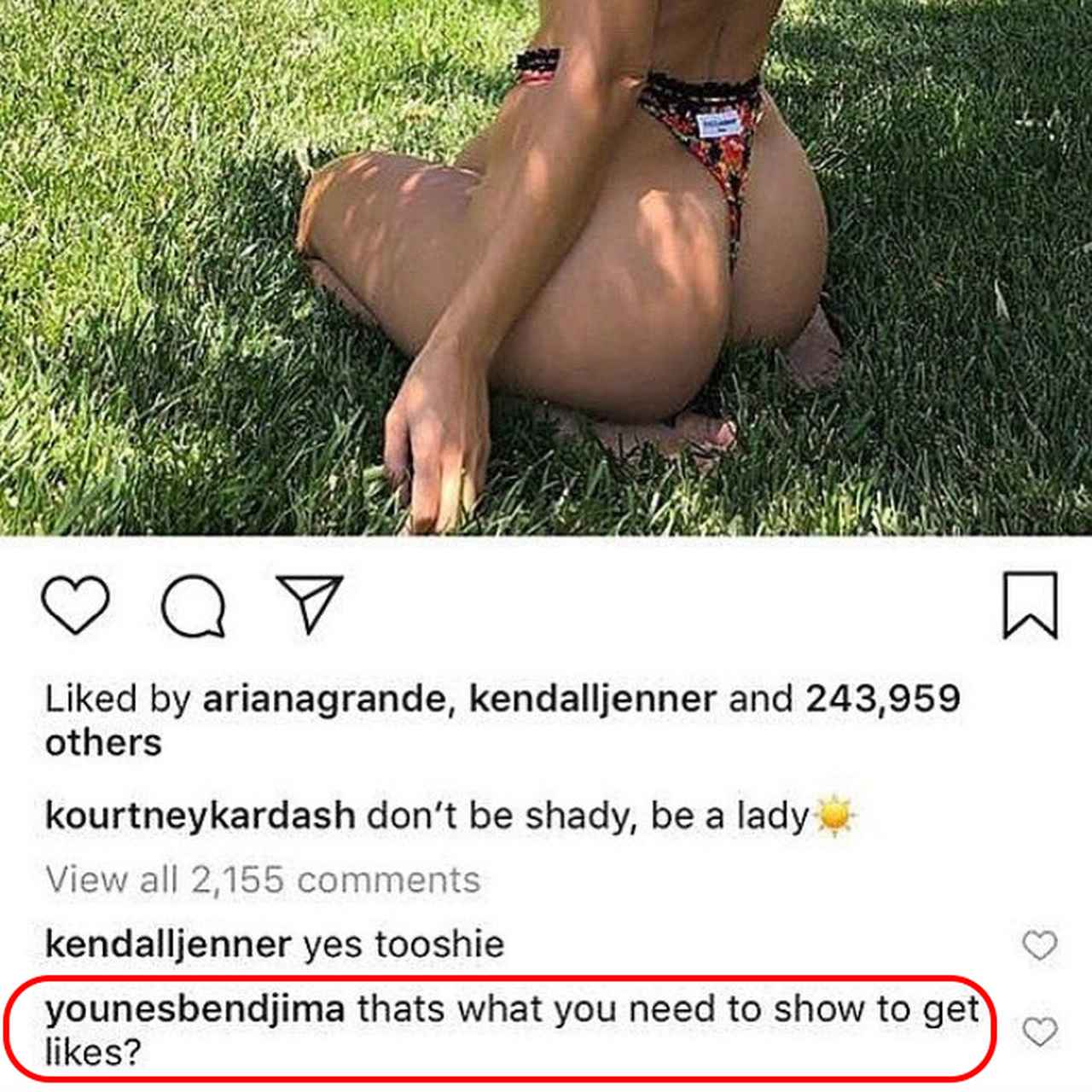 美尻が露わになったコートニーの見返りショットに、たくさんの「いいね」が集まり、妹ケンダル・ジェンナーも「イエス、お尻」と肯定コメントを残すなか、ユーネスが投稿したのはこんな辛辣なコメントだった。