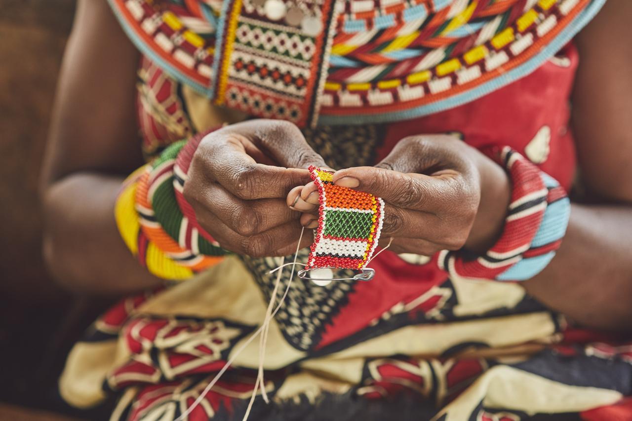 サンブル族の女性がエレファントバッグのためにビーズ細工を手作業で行う姿。