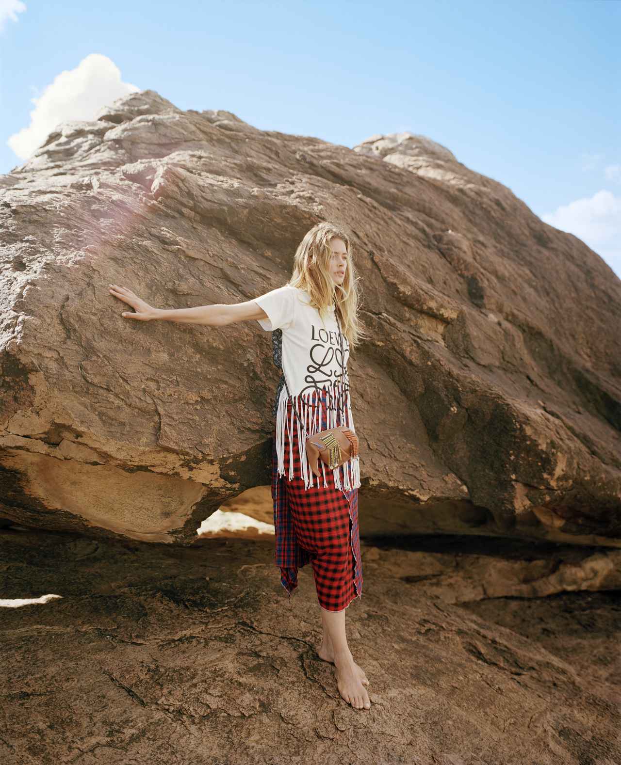 ドウツェン・クロース、ロエベのエレファントミニバッグを着用してケニアで撮影。