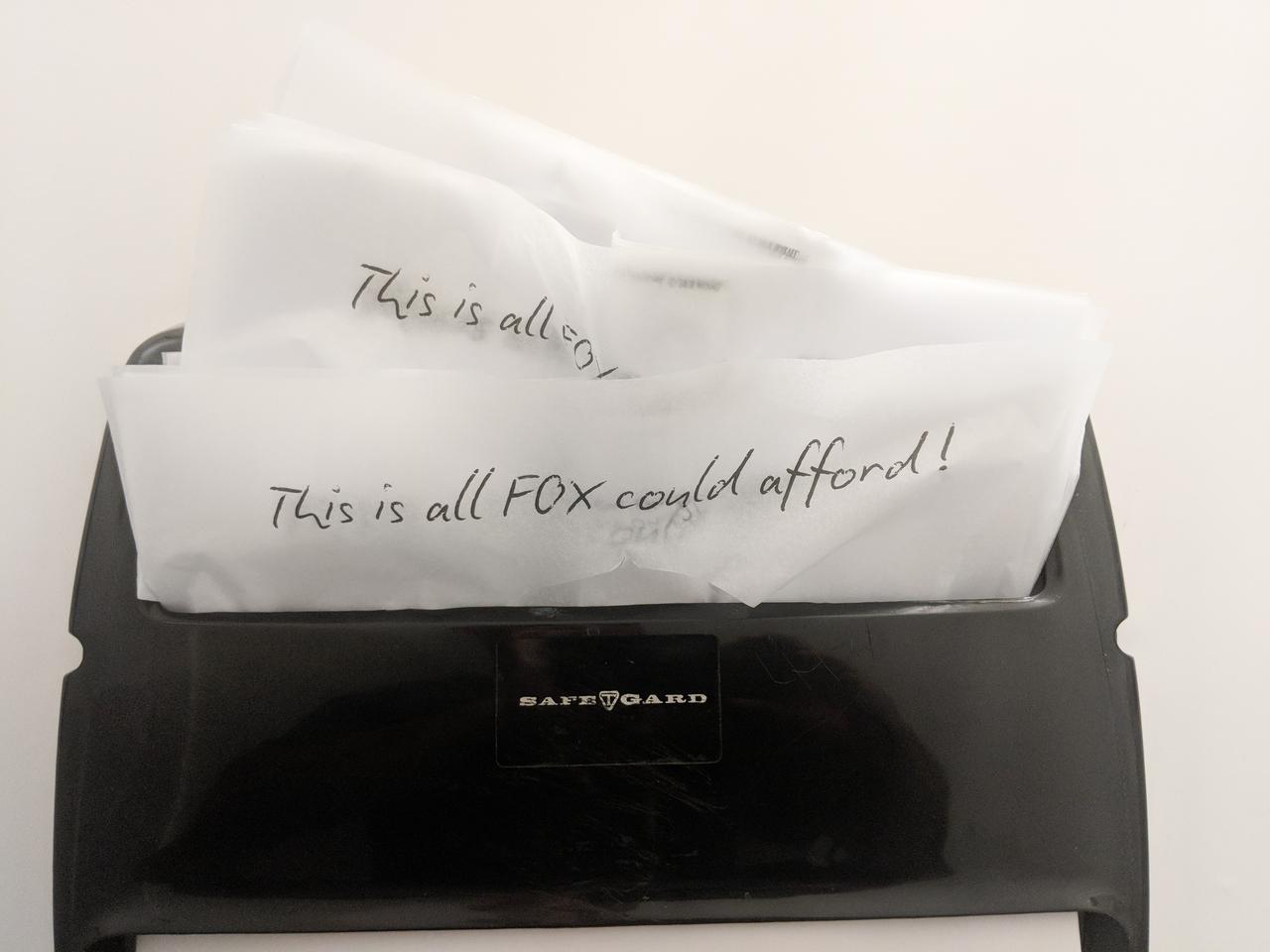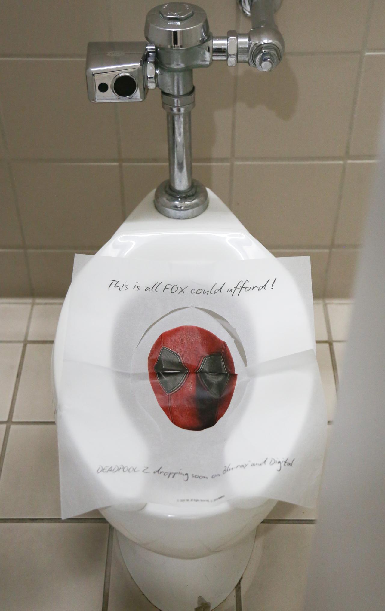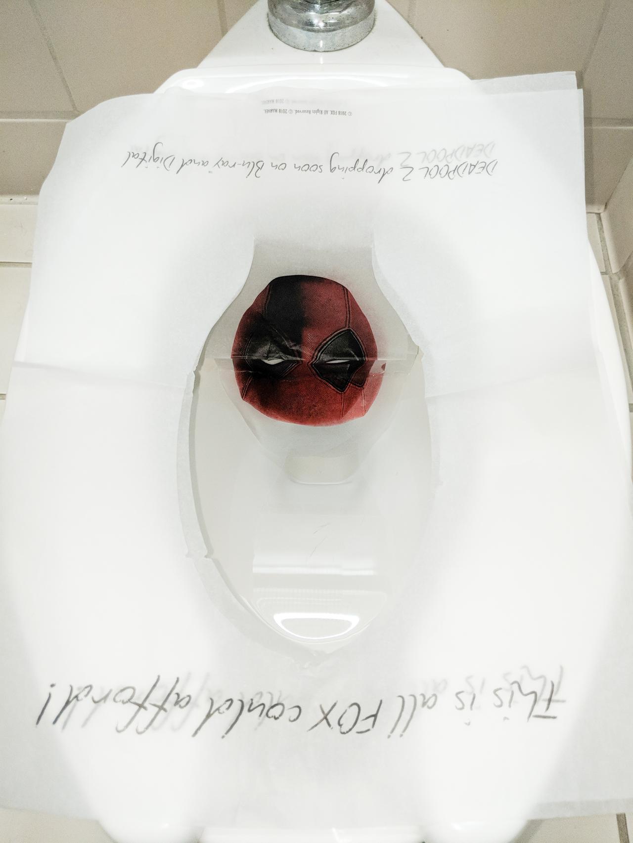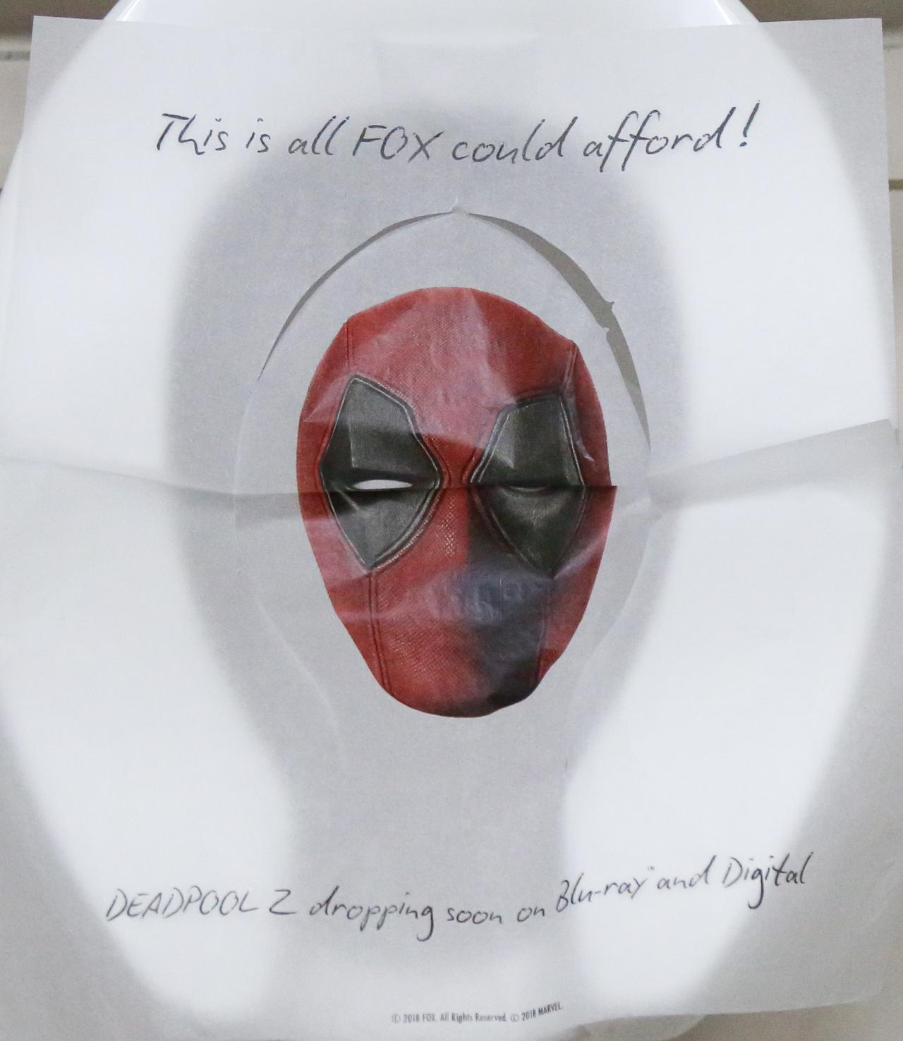 これを敷いて用を足すと、必然的にデッドプールの顔面にかかるという仕掛けのシートペーパーには、手書き風の文字で「FOXはこれしか用意できませんでした」と書かれたメモが。