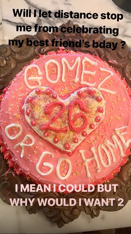 「遠距離が私の親友の誕生日を祝福する妨げになるとでも?そんなことさせないわ」というコメントともに、「ゴメスORゴーホーム(家に帰る)」とセレーナの名前にかけたメッセージが描かれた手作りケーキをインスタグラムのストーリーに投稿した。
