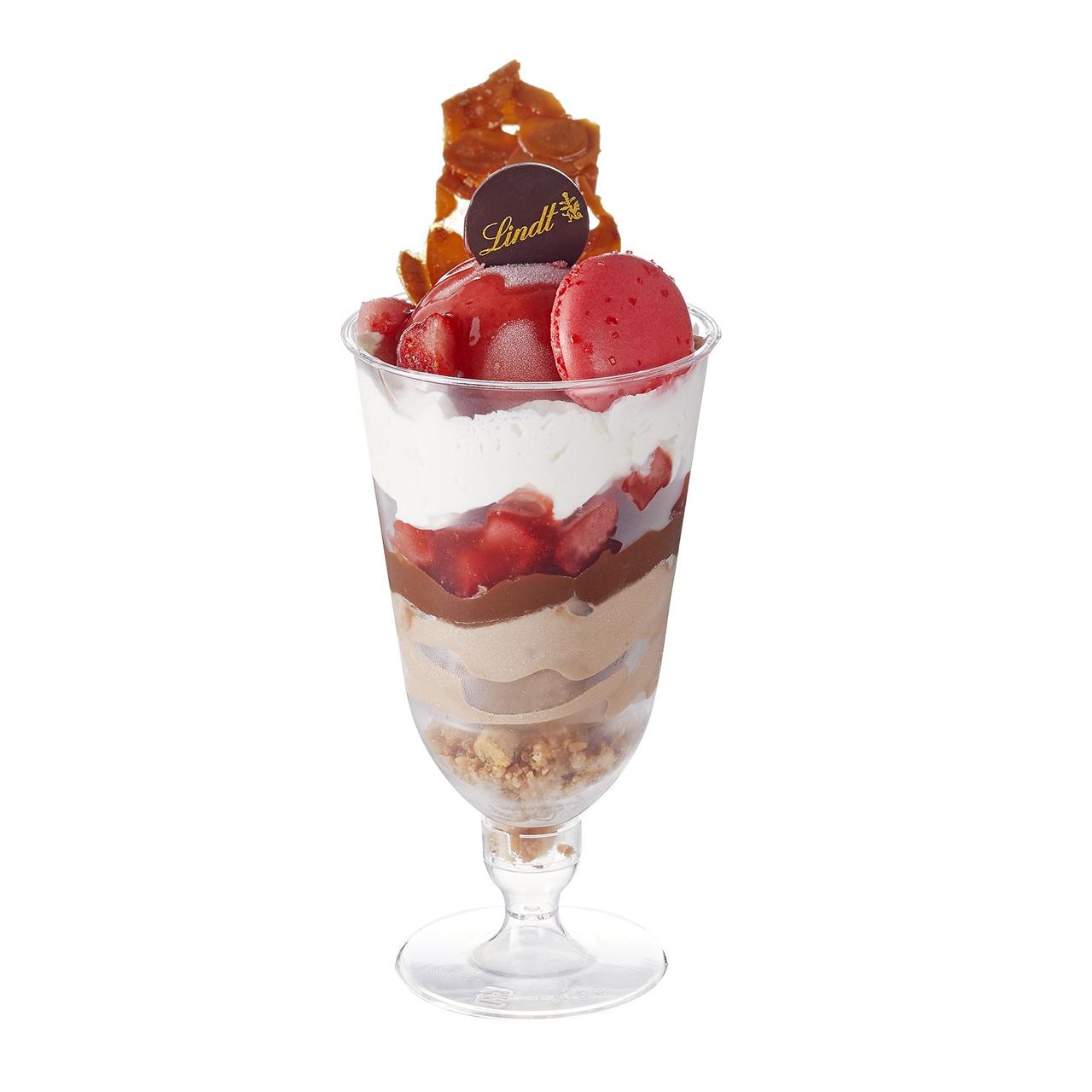 リンツ ストロベリー ショコラパフェは、まろやかなミルクチョコレートのソフトクリームに、甘酸っぱいストロベリーを組み合わせたチョコレートパフェ。