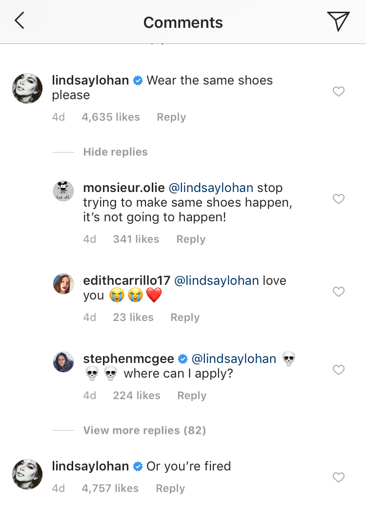 そんなコメントにリンジーはすぐさま噛みつき、「お願いだからジョークだと言ってくれ」というコメントに返信する形で「大真面目よ」と答える強気の態度を見せた。(フロントロウ編集部)