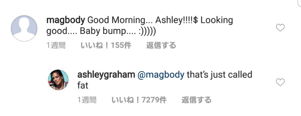 数々のコメントが書き込まれるなか、アシュリーはあるコメントを選んで返信。そこには、「おはようアシュリー!!!素敵だね…大きくなったお腹が…:))))」と書かれており、アシュリーはそのコメントに「これはただの脂肪と呼ぶのよ」と強烈な一言を返した。