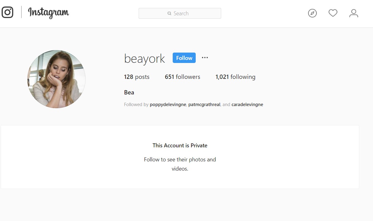 ベアトリス王女のアカウント。フォロワーには、カーリーのほかにも、モデル兼女優のカーラ・デルヴィーニュやヘンリー王子の元恋人のチェルシー・デービーなどといった有名人が名を連ねている。©Beayork/ Instagram