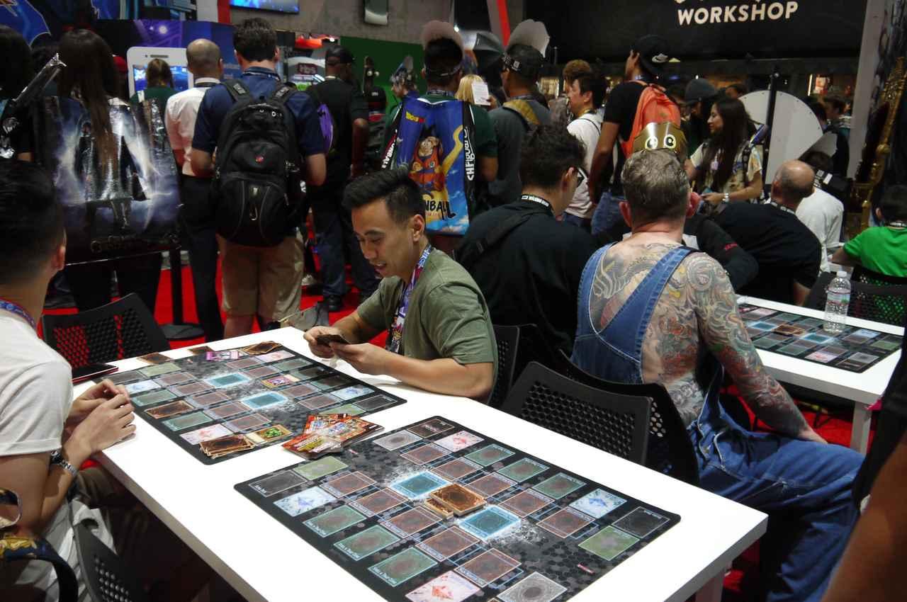 日本の会社コナミのブースには、大きな遊戯王のポスターが貼られており、ファン同士でカード対戦できる場所も。