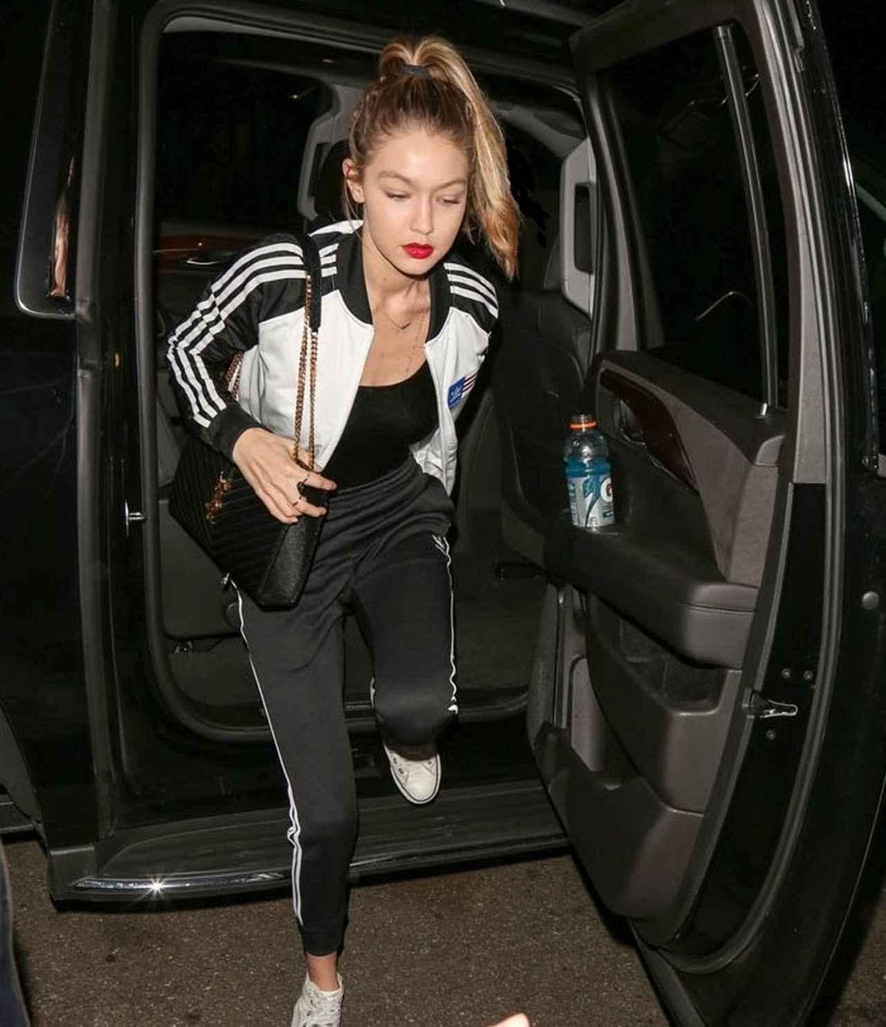 adidas(アディダス)のジャージをセットアップで着用したジジは、足元はCONVERSE(コンバース)のスニーカーでモノトーンでまとめたアスレジャーなコーデに、Saint Laurentのチェーンバッグでモデルらしくスタイルを格上げ。。