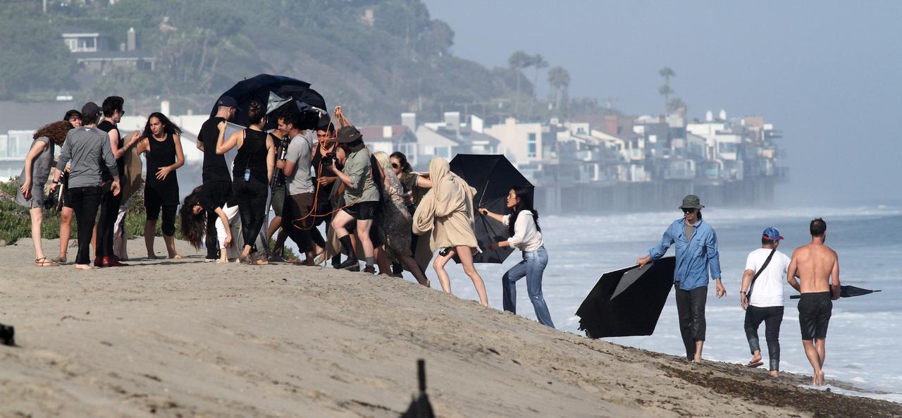 ガガ1人に対して、メイクアップアーティスト、スタイリスト、カメラマン、その他大勢のスタッフが付き付き添って撮影を行っており、ガガが砂浜に上がってくると現場は大混乱。実際には、この他にも車で待機するスタッフやボディーガードなどもいるので、もっと大人数なはず。