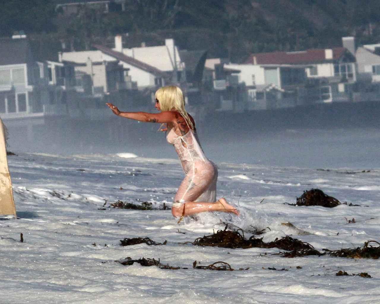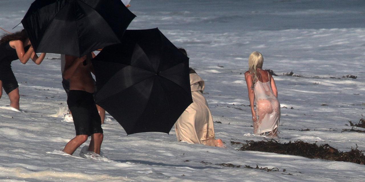 この日、マリブの海で撮影を行ったレディー・ガガ。撮影ではプラチナブロンドのヘアをお披露目し、シースルードレスやブラックのミニドレス、さらにはトップレスなど、何度も服装を変えて撮影を行っていた。