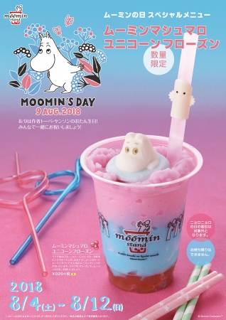 フィンランドの童話「ムーミン」をモチーフにしたドリンクスタンド「ムーミンスタンド」にて、8月9日「ムーミンの日」を記念した限定ドリンク「ムーミンマシュマロ ユニコーンフローズン」を2018年8月4日(土) ~ 8 月12日(日) の期間限定で販売。