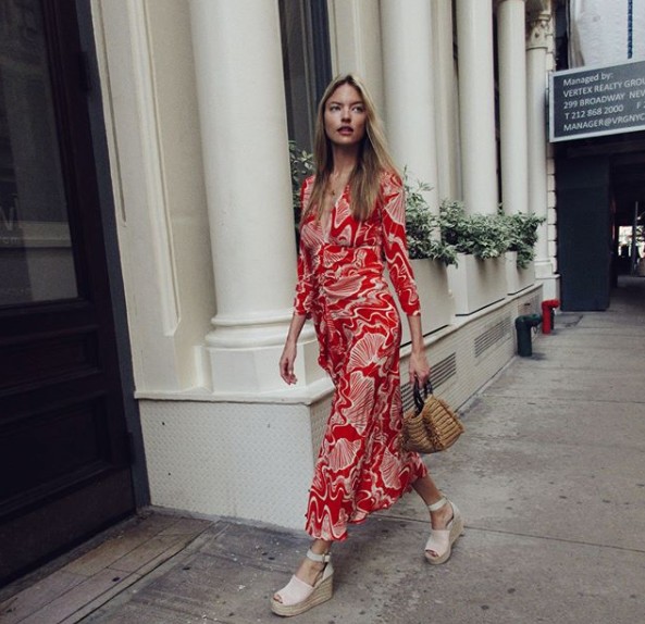 赤が目を引くRixoのマキシ丈ワンピースにMarc FisherのウェッジソールサンダルとCarolina SantoDomingoのかごバッグで夏らしさを盛り上げて。