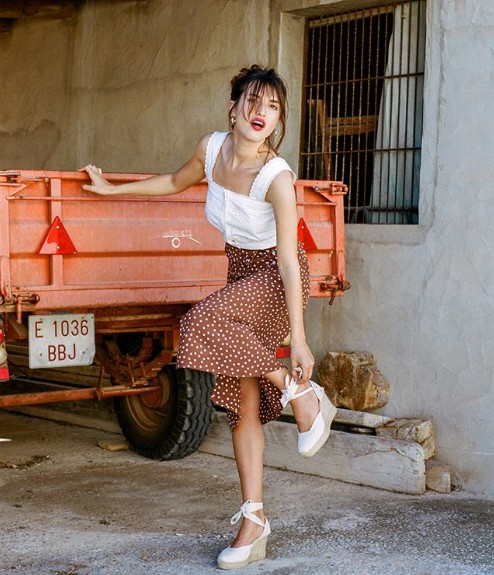 フランスを代表する新ファッションアイコンのジャンヌは、レースのキャミソールにドット柄のラップスカートでガーリーかつセクシーに。そこに白のレースがついたウェッジソールサンダルを合わせて、ガーリー気分をさらにアップ。
