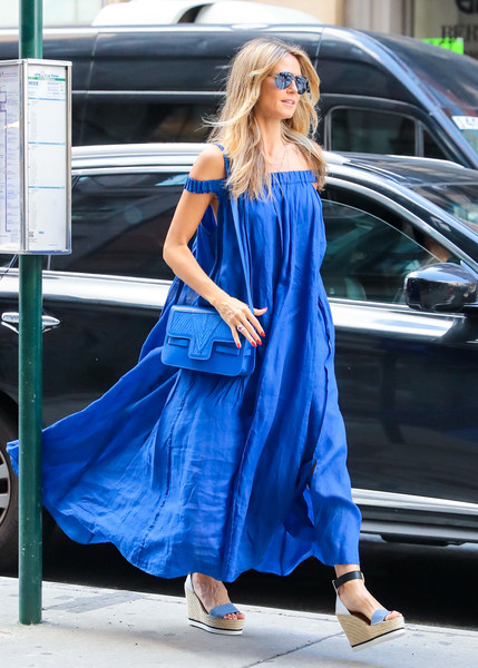 Three Gracesのロイヤルブルーのマキシ丈ドレスに合わせた、See ByChloéのウェッジソールサンダルは、デニム素材になっており、ドレスの青と相性抜群。ショルダーバッグもブルーで統一し、難易度の高いカラーコーデをさらりと着こなした。