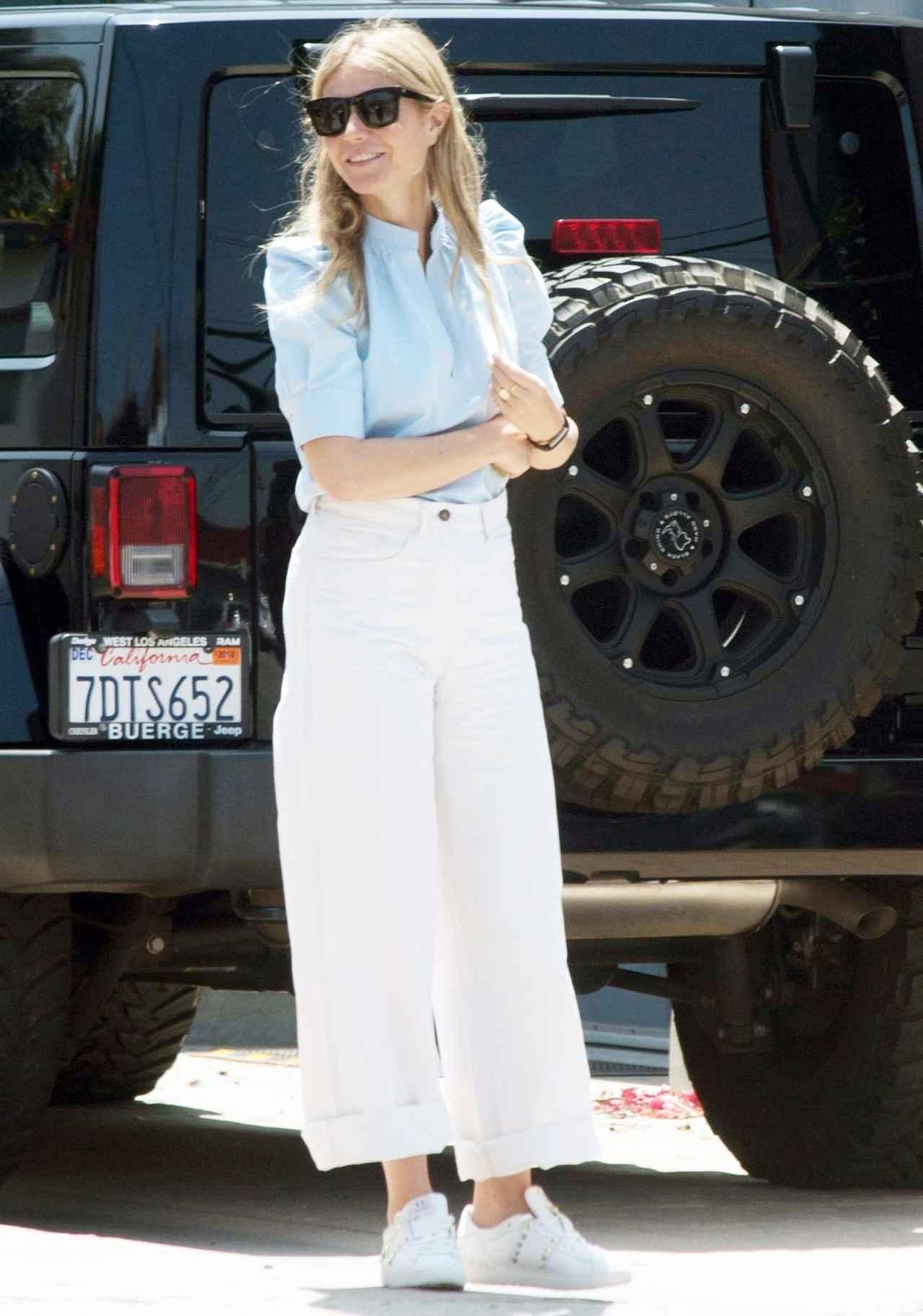 ジー・レーベル(G. Label)のトレンドのパフスリーブブラウスを、爽やかな白ワイドパンツにINした旬なスタリングのグウィネス。