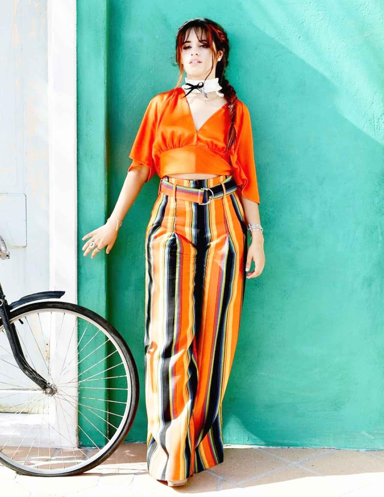 鮮やかなオレンジのダイアン・フォン・ファステンバーグ(Diane von Furstenberg)のトップス+ワイドパンツで、夏らしいビタミンカラーでスタイリングしたカミラ。