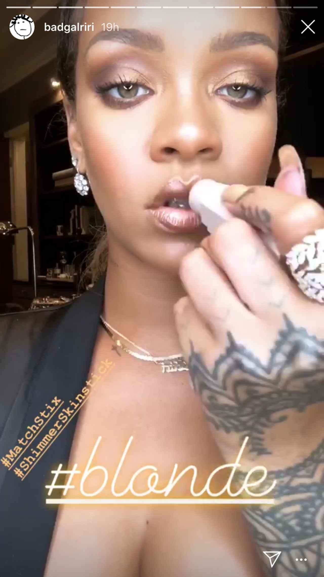そして仕上げに取りだしたのは、「マッチ スティックス シマー スキンスティック」というスティック状のハイライト。チークとしても使えるこのアイテムを、ハイライトやチークとして使うのかと思いきや、リアーナは大胆にもリップにオン!
