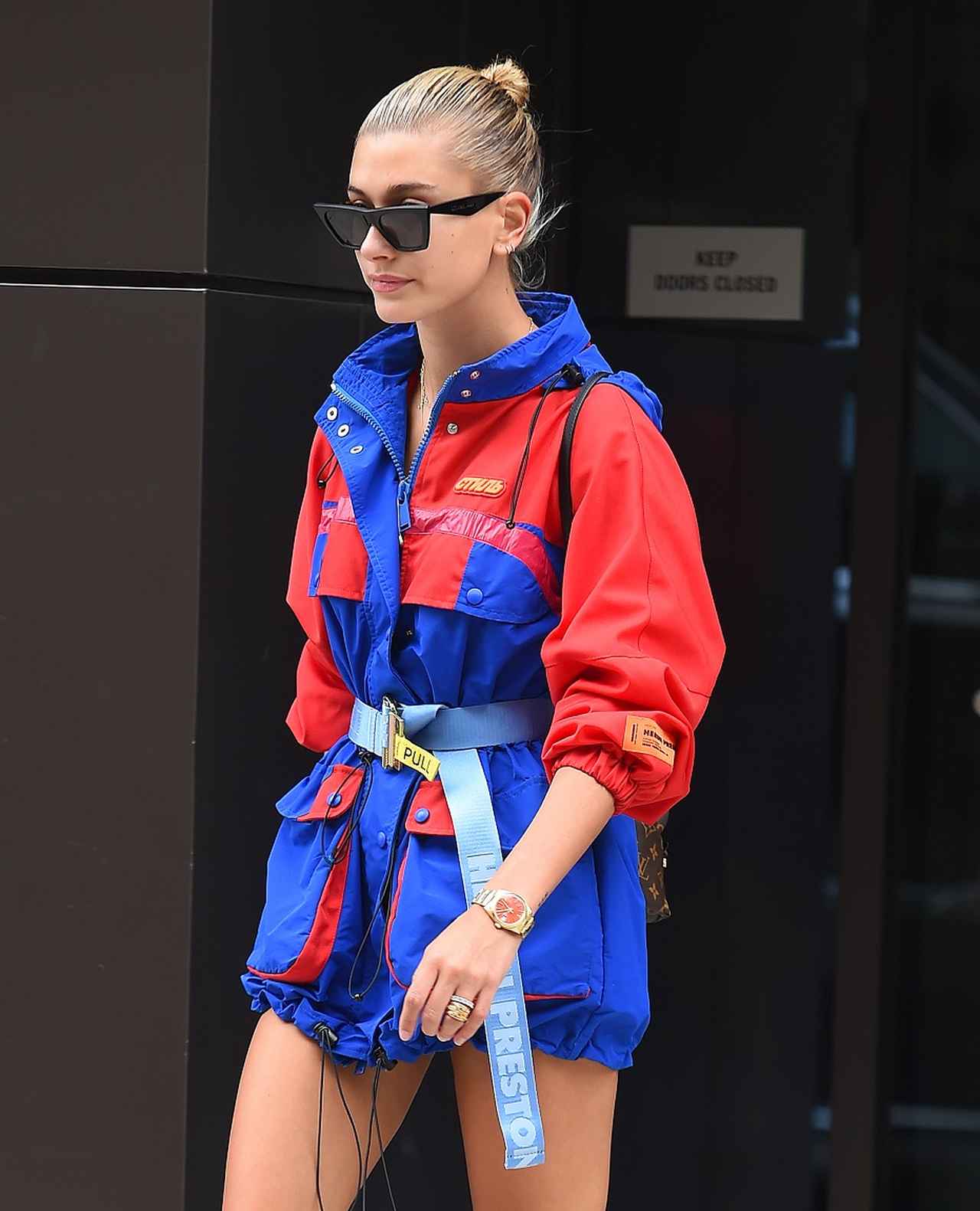 その代わりに、ヘイリーの左手薬指には小さなダイヤがぐるりと一周埋め込まれた、よりシンプルなデザインの細いシルバーの指輪が。さらに、その上には、かなりチャンキーなゴールドの指輪が重ねづけされていた。