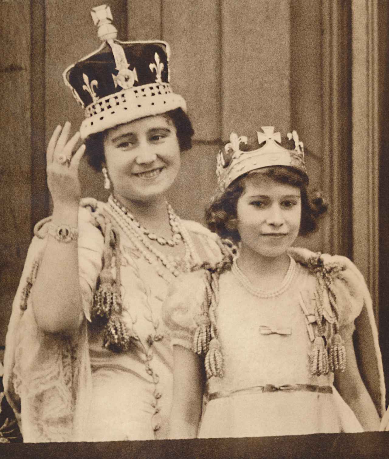 1937年5月12日に行われたエリザベス王太后の戴冠式にて。母エリザベス皇太后の隣にいるのがエリザベス女王。