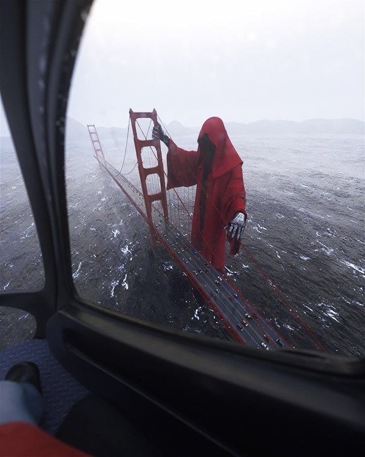 サンフランシスコ湾の入り口に架かる大きな赤い吊り橋に手をかけ、橋を渡る自動車を見下ろしているのは、なんと巨大な死神。