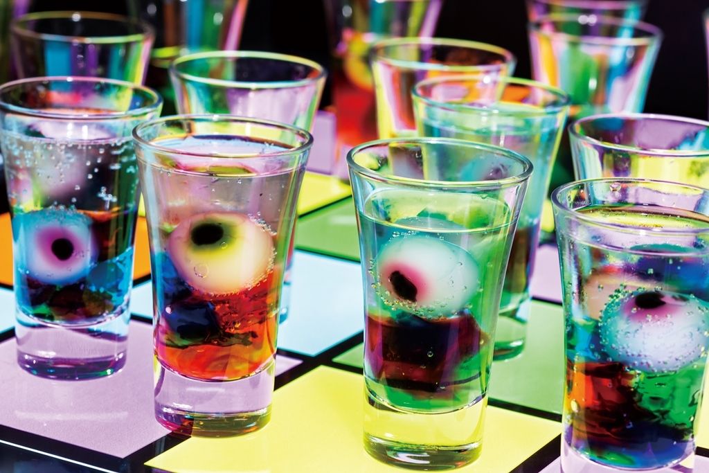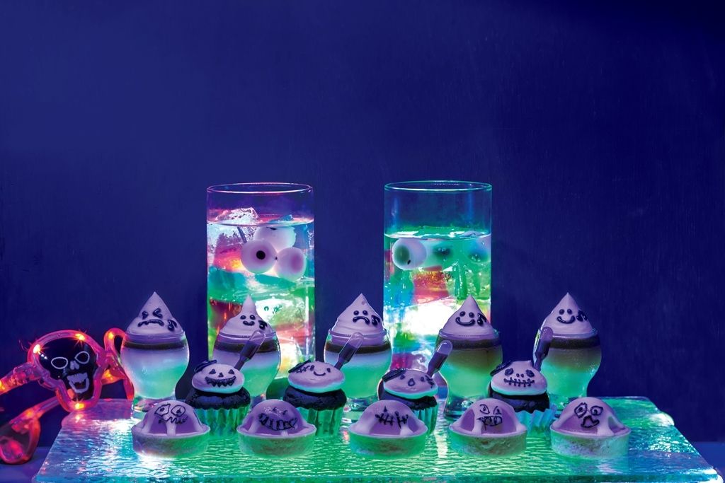 ディスコライトをイメージした3色のカラフルなゼリーの中からギョロっとした目玉が覗く「目玉のディスコダンスゼリー」や、血を思わせる真っ赤なラズベリーソースが入ったスポイトと、ミニサイズのレコード盤を頭に乗せた「デッド・ゾンビ・カップケーキ」など、新作ハロウィーンスイーツのほか定番スイーツを含む約20種類のデザートと、約15種類の軽食が派手かわなビュッフェ台に並ぶ。