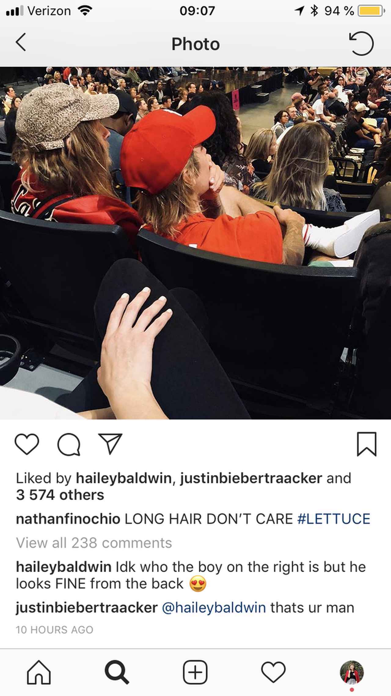 先日、ジャスティンが熱心に通うヒルソング教会の集まりに参加した際の写真を、2人の共通の友人ネイサン・フィノチオがインスタグラムに投稿したところ、ジャスティンとの婚約についてほとんど口を閉ざしているヘイリーが「右側に座る男性が誰だかは知らないけど、彼はうしろ姿が最高にカッコイイわね」とコメント。