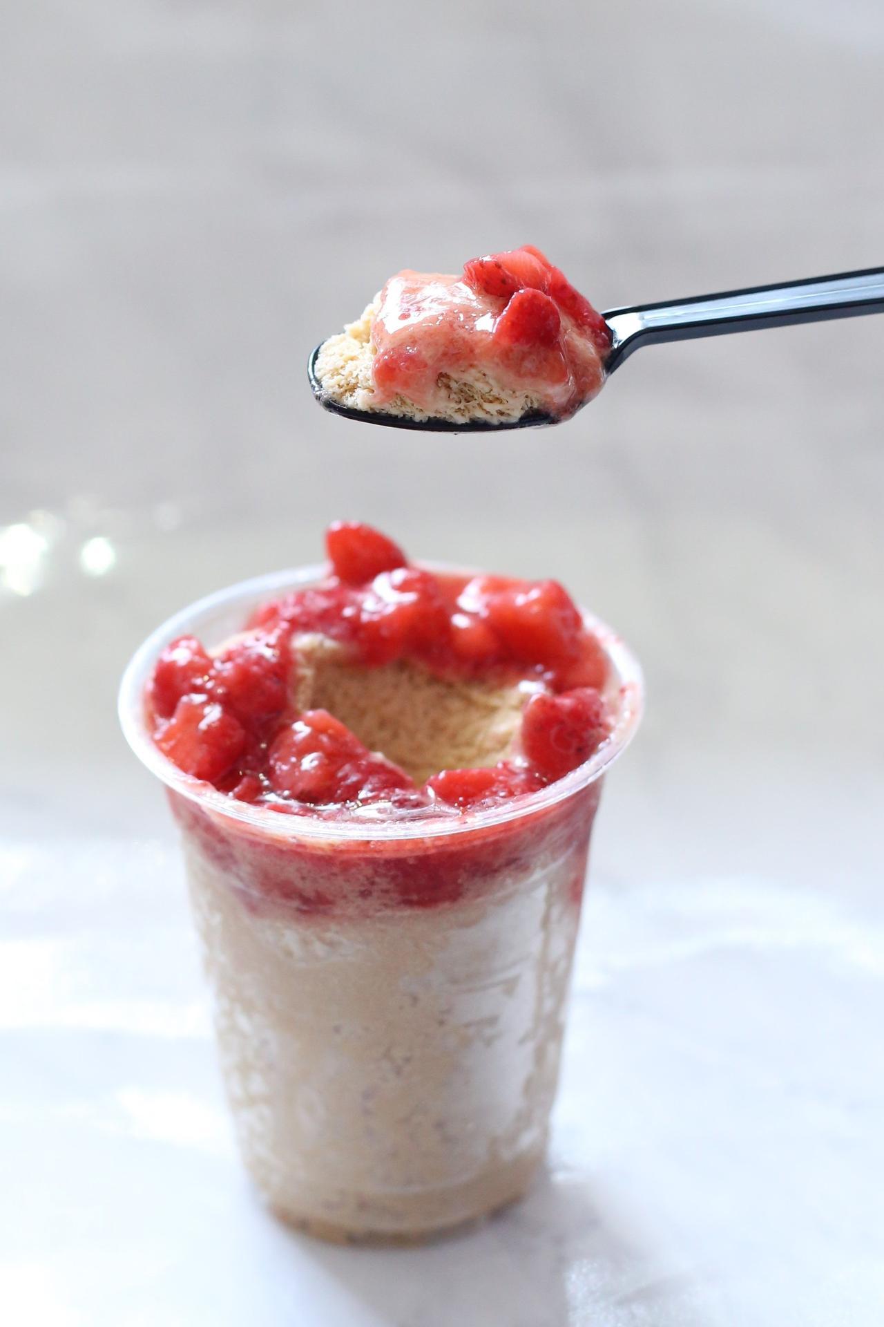 フローズンストロベリーのトッピングを添えて、見た目にも華やかに仕上げた。残暑を乗り切るには最高のひんやりスイーツ。
