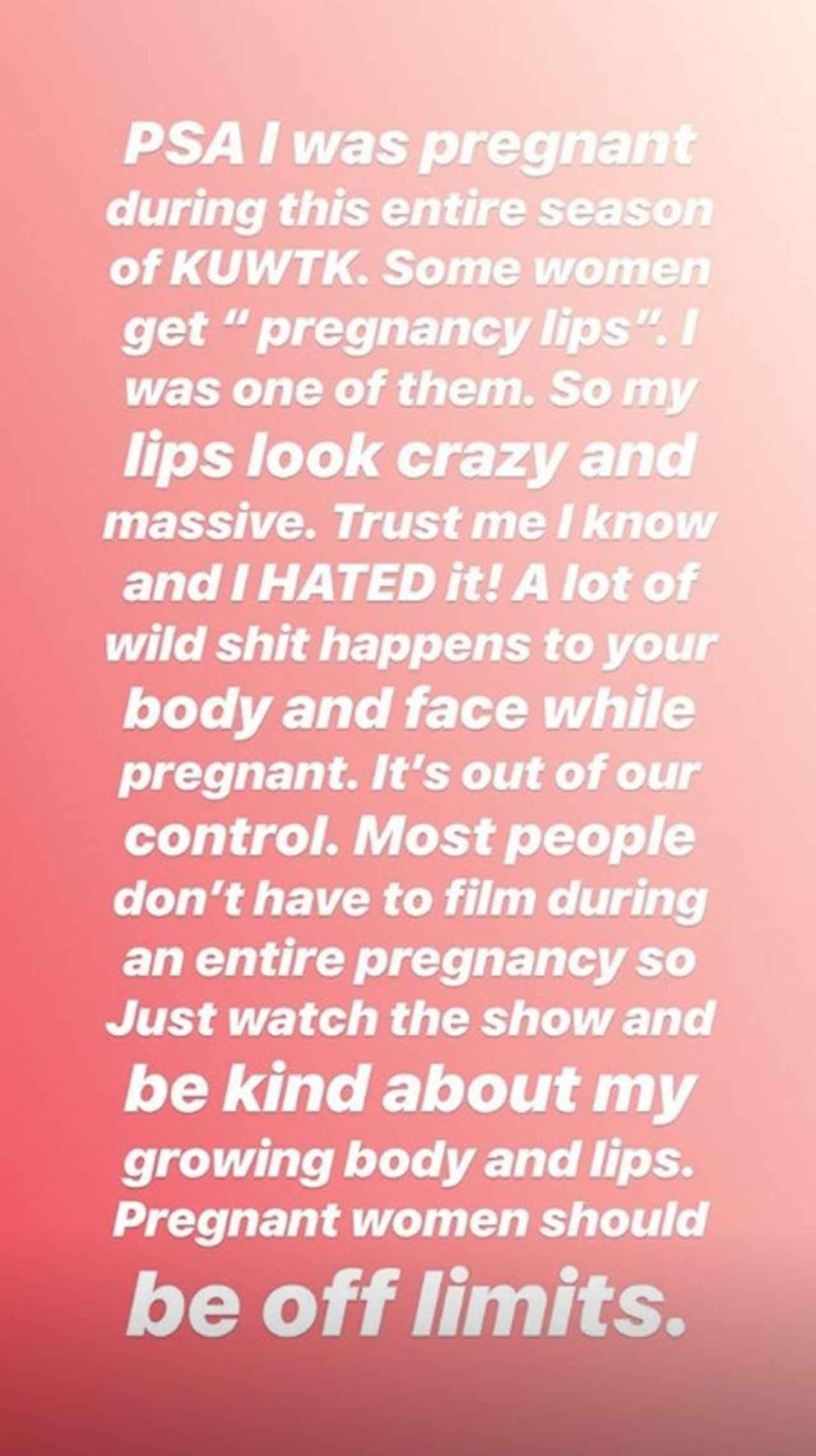 「大切なお知らせ:今シーズンを通して私はずっと妊娠していました。“妊娠リップ”になる妊婦がいますが、私もそのひとりでした。だから、(テレビに映る)私の唇はクレイジーなほど巨大に見えます。信じて、こんなの私だって嫌よ。妊娠中は体と顔にあらゆる異変が起きるし、それをコントロールできない。ほとんどの人は妊娠している期間ずっとカメラが回っていることはないと思うので、番組を見て私の体や唇が気になっても優しくして。妊婦をネタにするのは禁止よ」