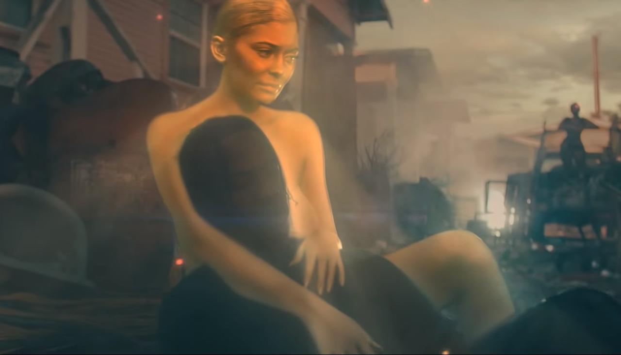 カイリーが登場するのは、MV中盤で神様になりきるトラヴィスを抱きかかえるシーンと、子ヤギを抱えるラストシーン。