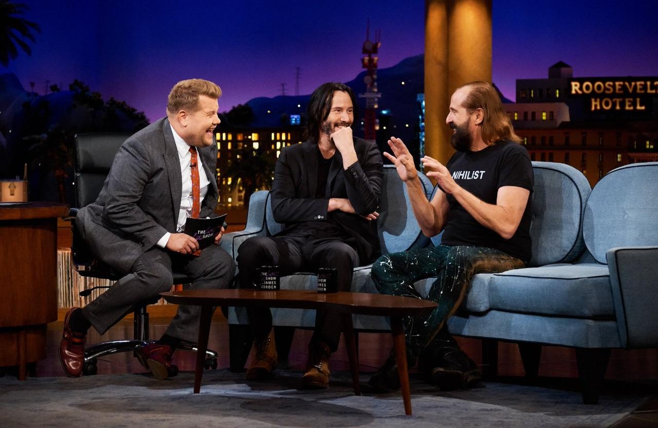 映画『ジョン・ウィック:チャプター2』で共演した俳優のピーター・スト―メアと一緒に番組に登場したキアヌ。©The Late Late Show / Twitter