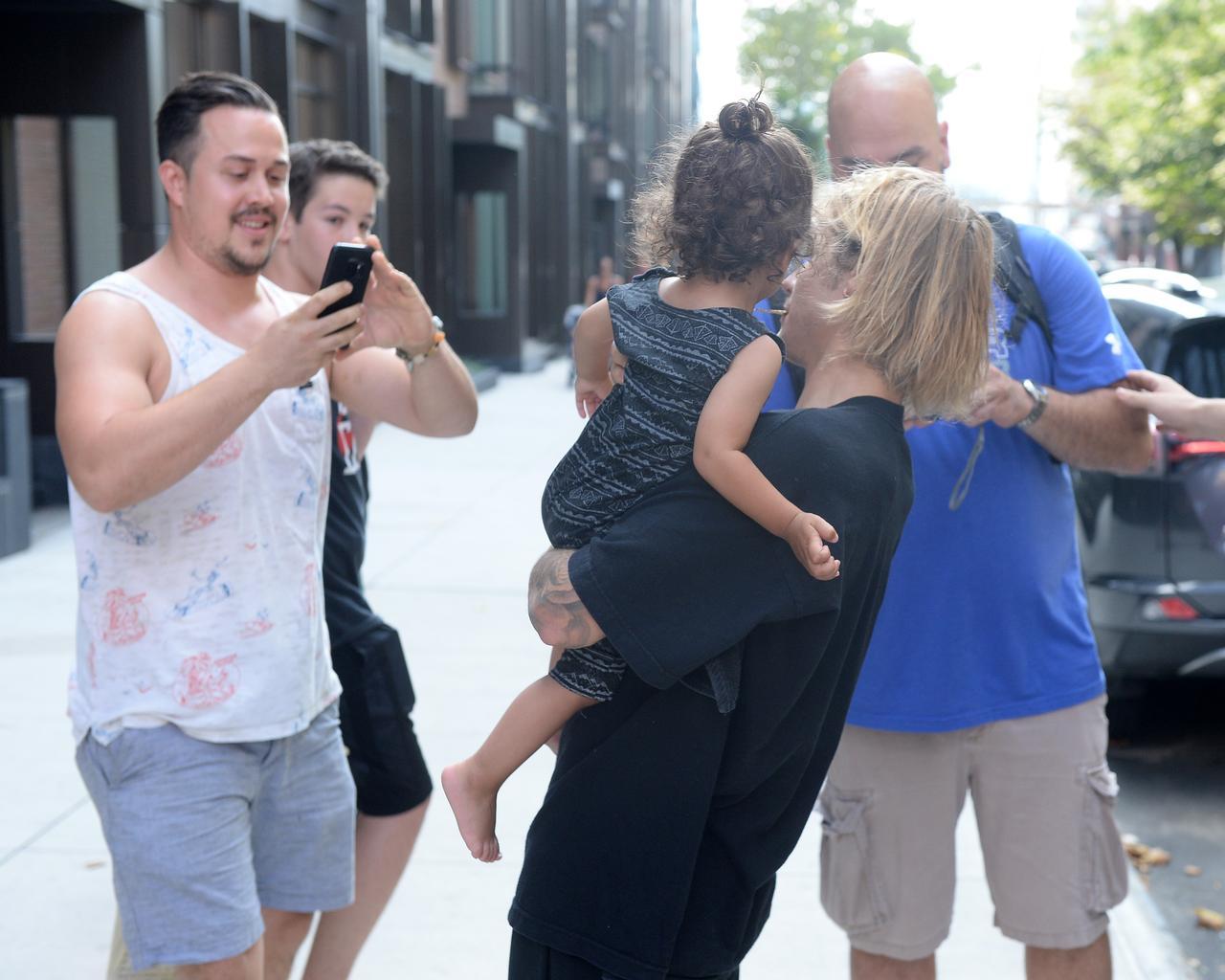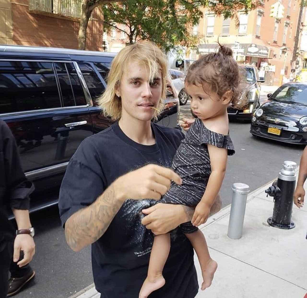 ジャスティンが思わず足を止めて触れあいの時間を設けてしまったのは、女性は女性でも小さな女の子。手慣れた様子で女の子を抱きかかえると、父親らしき男性がかまえたスマホのカメラに向かってにっこりスマイル。