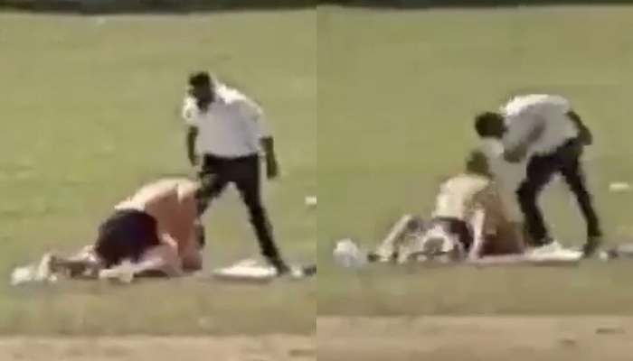 カップルに駆け寄った保護者の男性は、女性の上に覆いかぶさっていたい男性をいきなり平手打ち。競技場のほうを指差し、「もう5回も警察に通報されているぞ!」などと説教をすると、もう1発平手打ちをお見舞いした。