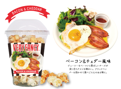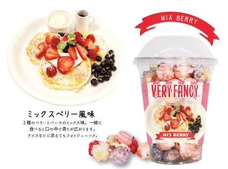 パンケーキ店として話題のVERY FANCY®で人気の味「ミックスベリー味」と「ベーコンチェダー味」をリアルに再現し、味にこだわったグルメポップコーン。