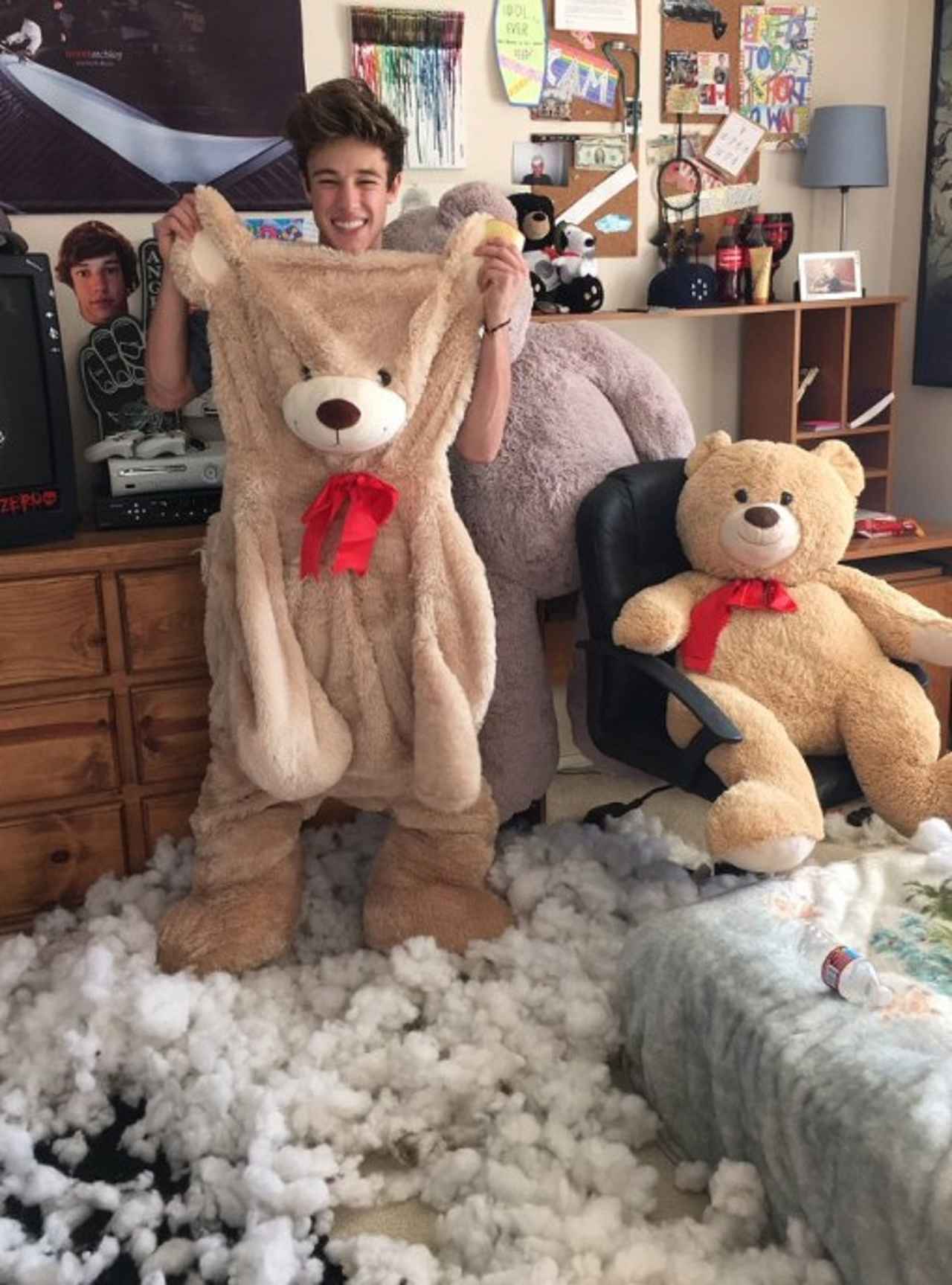 巨大テディベアの中身を全部出し、中に入って踊るという面白動画を公開。©Cameron Dallas/ Twitter