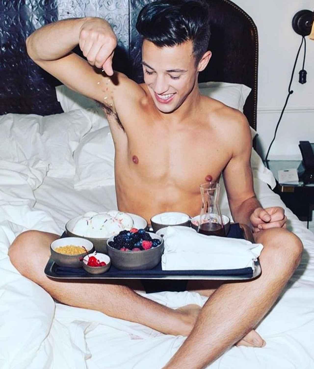 ベッドの上で裸でスイーツを食べるという、女子の好きなものてんこ盛りの写真を公開。この写真には100万件以上もの「いいね」がついている。©Cameron Dallas/ Instagram