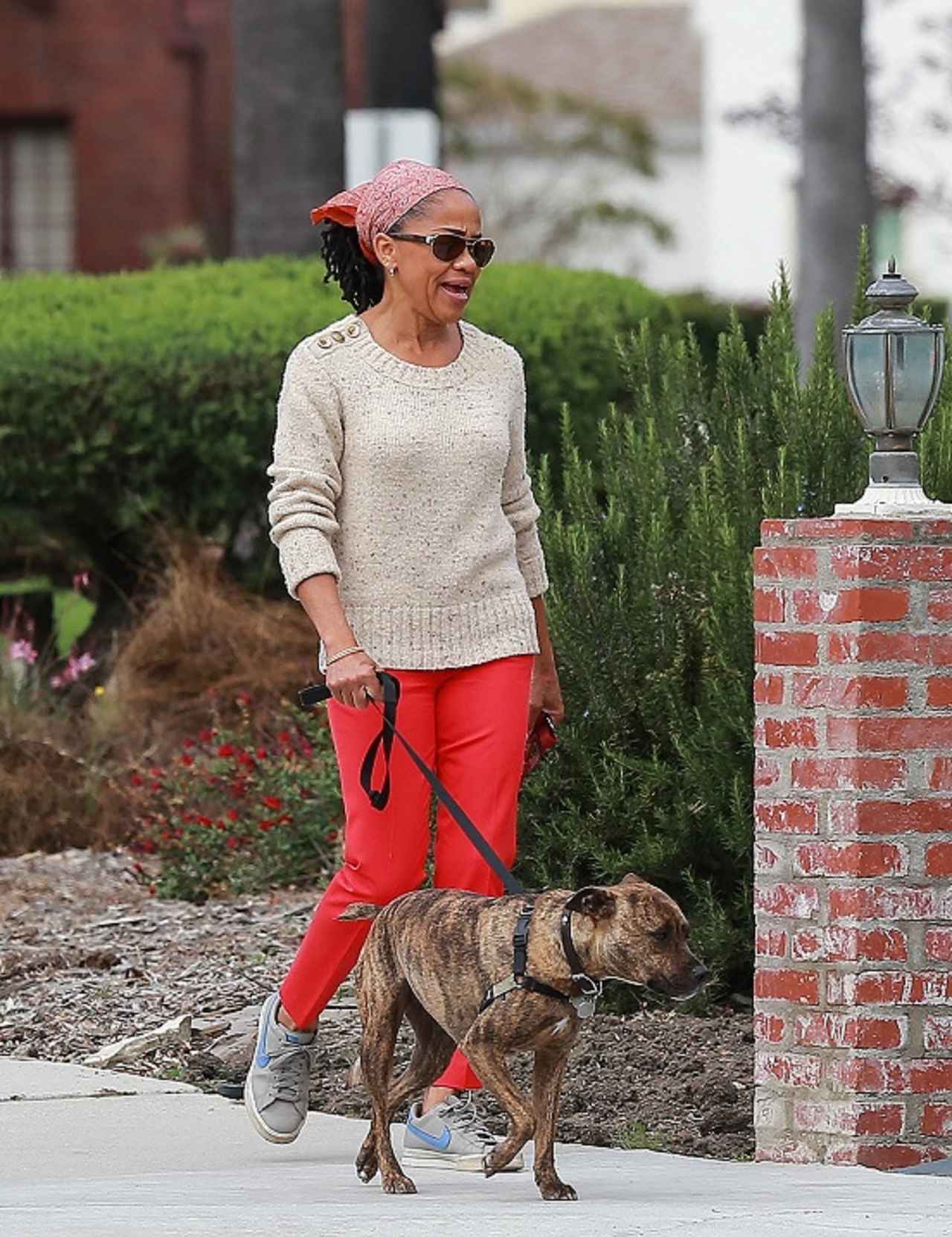 カリフォルニア州にある自宅近所で愛犬を散歩するドーリア。