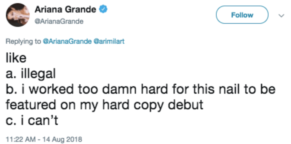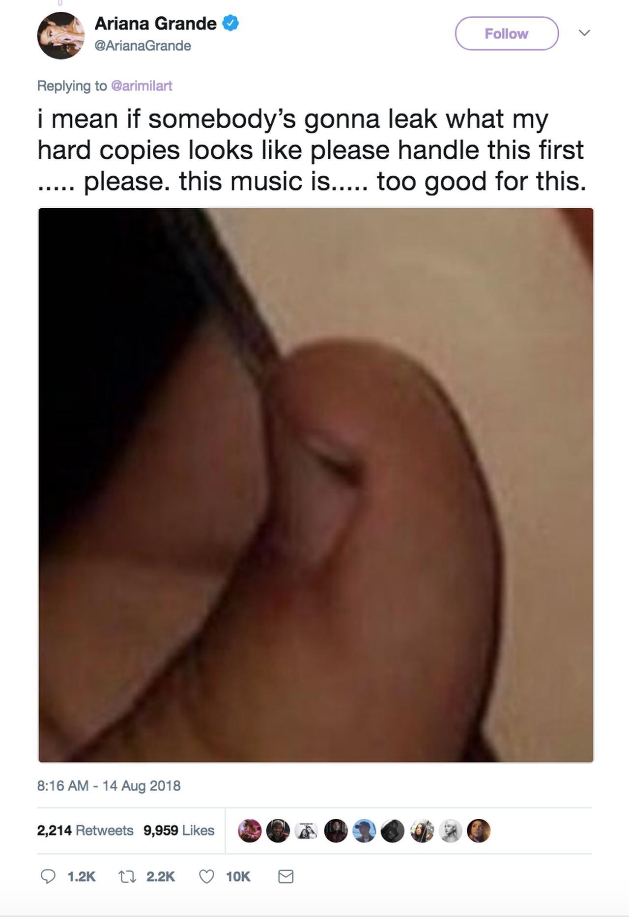 偶然、ツイッターで上の投稿を見かけたアリアナは、女性が“実際のアルバムのジャケットを流出させた”ということよりも、そのアルバムをつかむ彼女の手の“親指の爪”のほうが気になったようで、「お願い。もし私のアルバムの実物を流出させるなら、せめて爪ぐらいキレイにしてちょうだい。私の音楽はこの爪にはもったいない」とコメント。