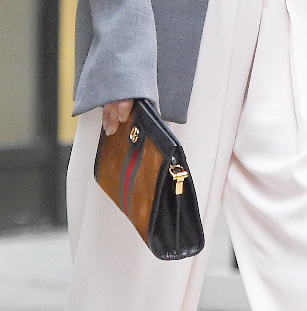 手に持ったのは、Gucciのゴールドショルダーバッグ。チェーン部分をインしてクラッチバッグとして持ったのが◎。