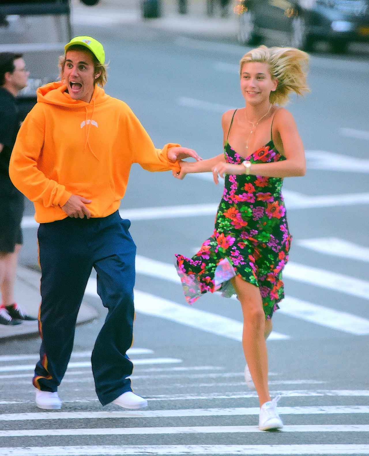 信号を渡る途中に、パパラッチを見ながら笑顔で走るジャスティンとヘイリーが可愛い!