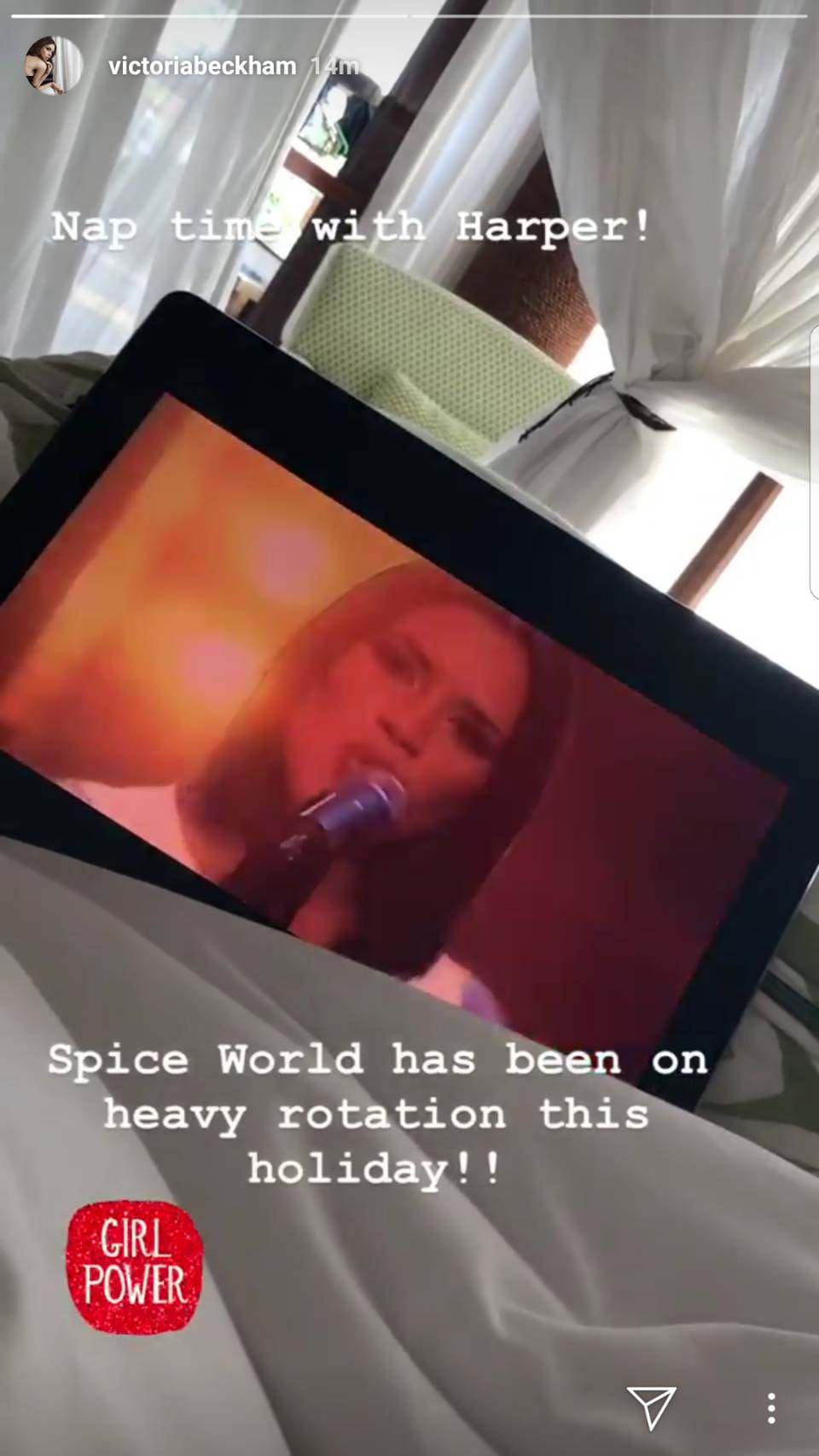なんと、ハーパーちゃんがこの日のお昼寝のお供にしたのは、ヴィクトリアがスパイス・ガールズとして活動しているときに撮影された映画『スパイス・ワールド』。この映像は1997年のもので、今のヴィクトリアとはまったく違う姿。