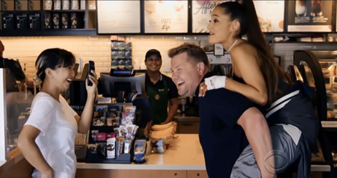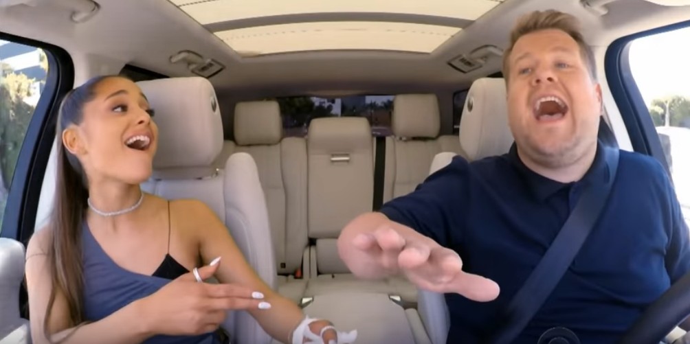 つい先日、同番組のホストであるジェームズ・コーデンと映画『タイタニック』の再現パフォーマンスを披露した動画が話題になったアリアナが、今度は、これまでにも数々のアーティストたちが出演してきた名物コーナー『カープール・カラオケ(相乗りカラオケ)』に登場した。