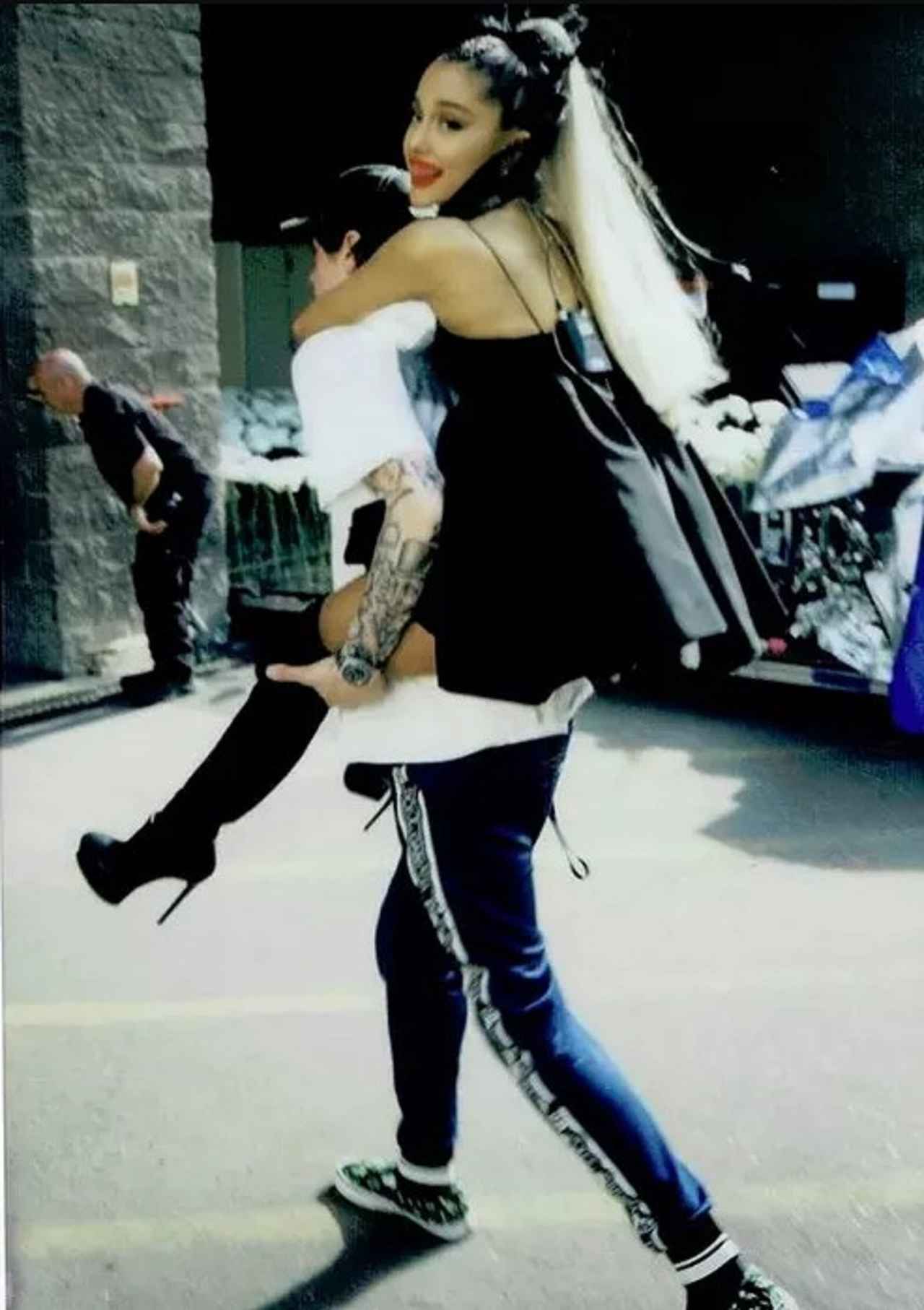 シンガーのアリアナ・グランデが「おんぶ」でコーヒーチェーン店のスターバックスに来店。一体何のために?