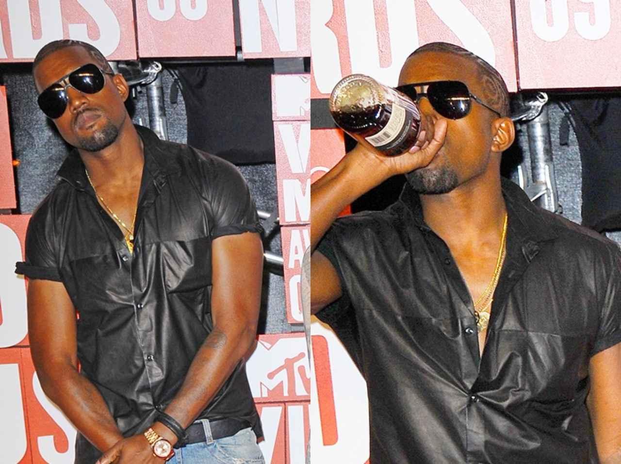 衣装こそカジュアルなカニエだけれど、アクセサリー代わりなのかレッドカーペットにお酒を持ち込み、堂々とボトルからラッパ飲み。この年のVMAでテイラー・スウィフトの受賞スピーチに乱入し、今でも続く因縁の関係が始まった。