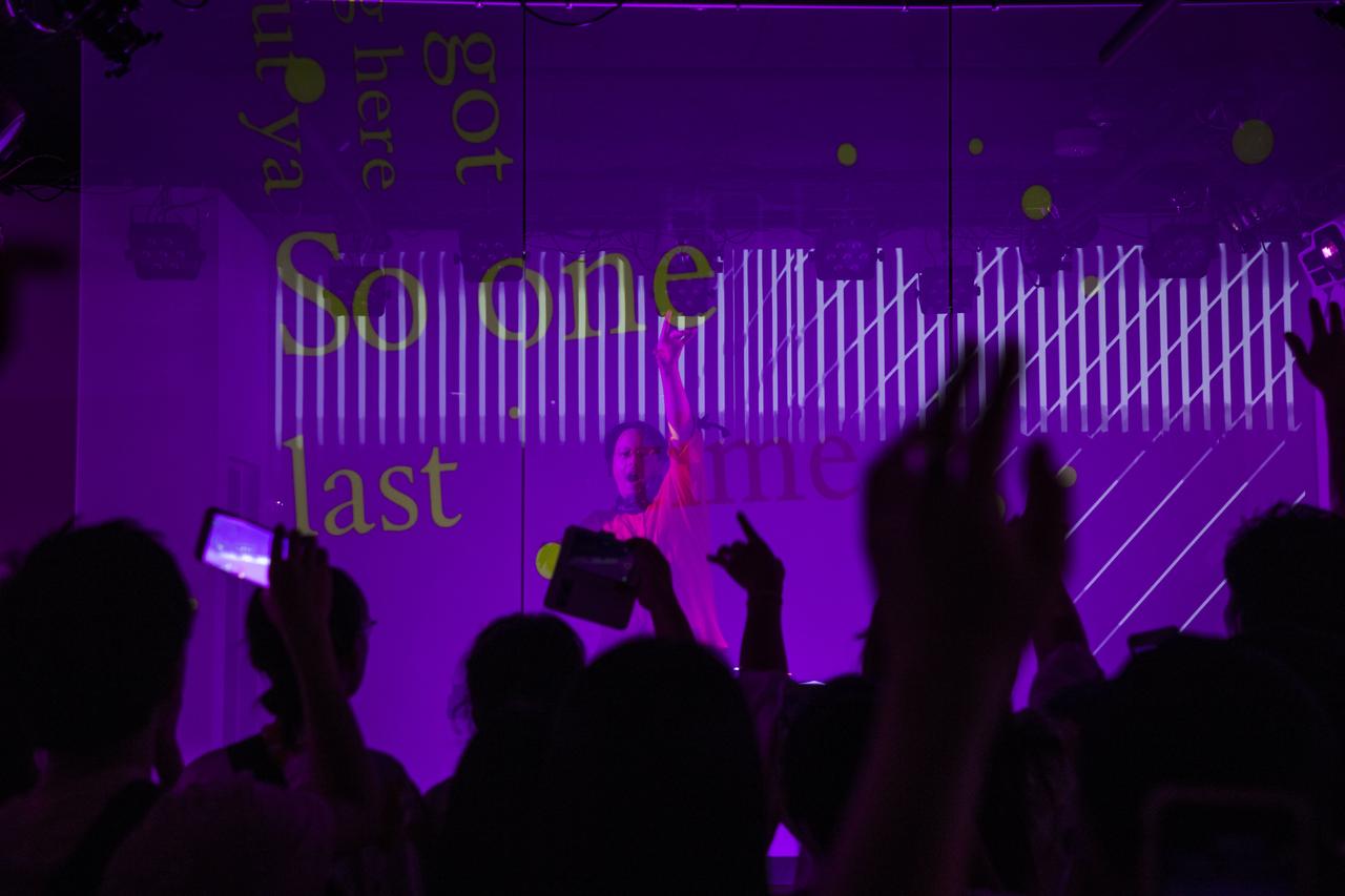 アリアナのファーストアルバムから最新アルバムまでがDJパフォーマンスで楽しめた今回のリリースパーティーのユニークなところは、DJブースの前に設置されたスクリーンと両脇の壁に歌詞が流れるところ。このスクリーンに投影される歌詞とシンクロしながら、DJのTJOとカワムラユキが“ストーリーテリングDJ”となってアリアナの言葉をMIXしてストーリーを紡いだ。