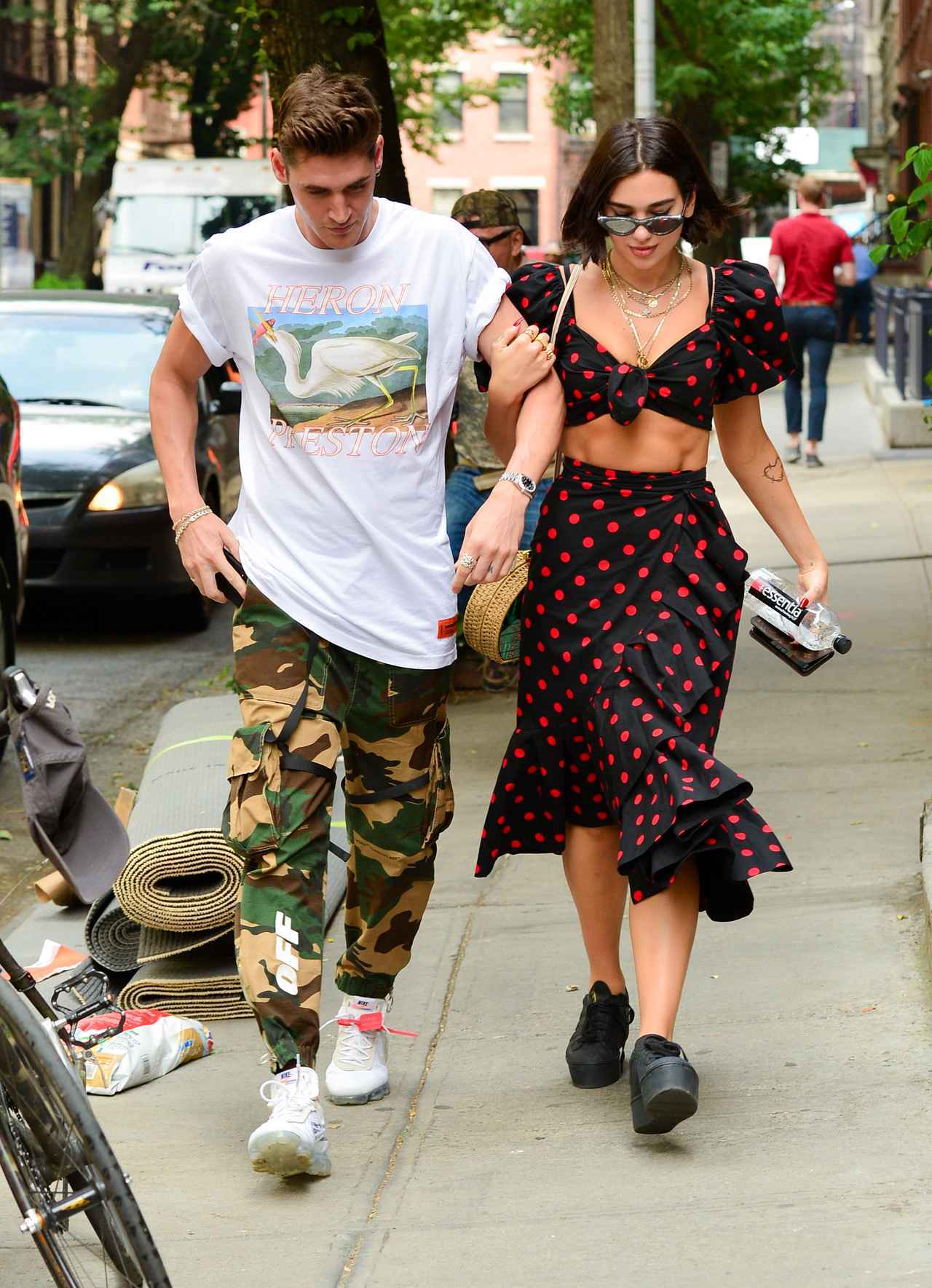 モデル兼シェフのアイザック・カルーと交際しているデュア。アイザックとのデートでは、大ぶりフリルがドラマチックなスカートと、胸元できゅっと結ばれたフロントノット・トップスのMarianna Senchinaのセットアップでキュートに。足元は黒のスニーカーでカジュアルに崩して個性をアピール。