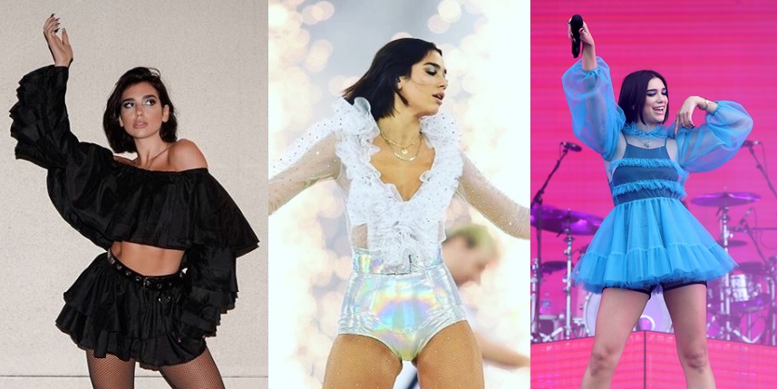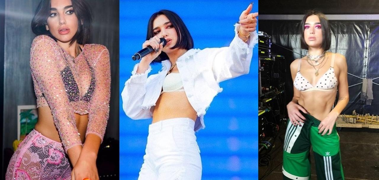 セクシーかつスポーティなスタイルを好むデュアは、見せブラを衣装に取り入れることが多い。ハイウエストボトムスと合わせて、見事に鍛えられた腹筋をアピール。