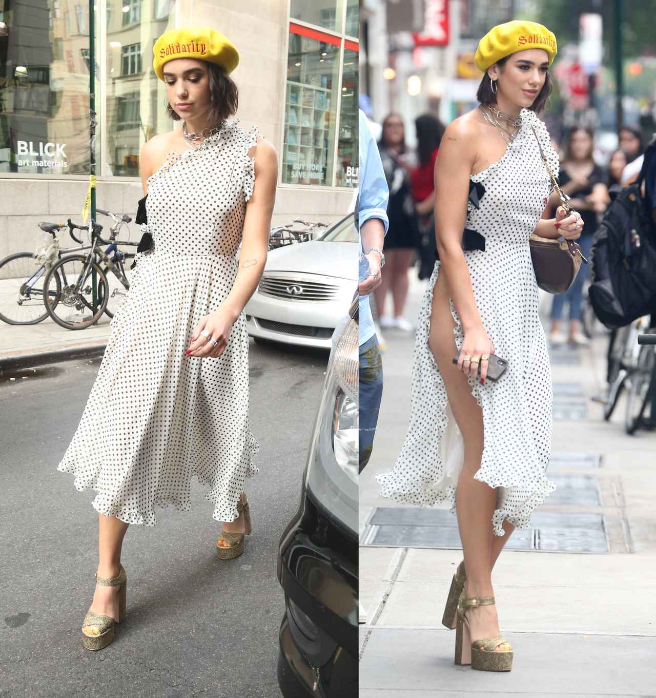 イベントに出席したこの日は、Marianna Senchinaのドット柄のワンショルダーワンピースでガーリーな気分。と思ったら、横から見ると超深いスリットが入っており、かなりセクシー。Itchy Scratchy Patchyのベレー帽で黄色を差し色にしたのがポイント。プラットフォームサンダルはLaurence Dacade。