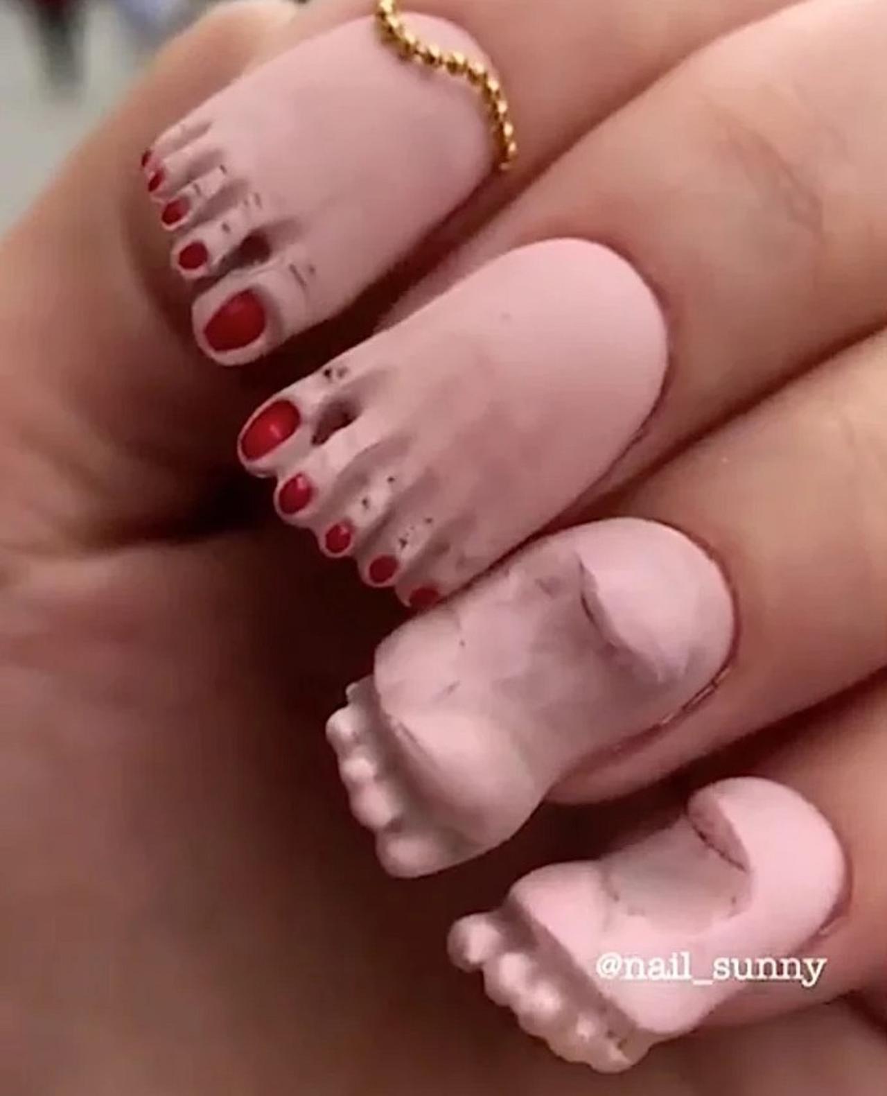 手の爪に「足」をモチーフにしたネイルを施すというユニークすぎるネイルアートが一周まわって秀逸。