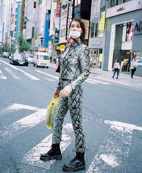 日本に来日した時に来ていたパイソン柄ジャケットとパンツのセットアップも、実はMiaouのもの。そこにDr. Martenのブーツを合わせてどこかメンズライクに落とし込んで。